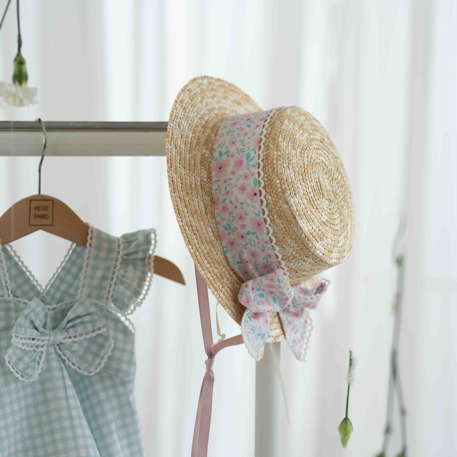 Our straw hat, adorned with a floral or gingham fabric ribbon, is the perfect detail to enhance summer looks. Lightweight, refined and full of charm, it protects from the sun with style. Inside, a small ribbon allows you to adjust the size for a perfect fit, even on the smallest heads.