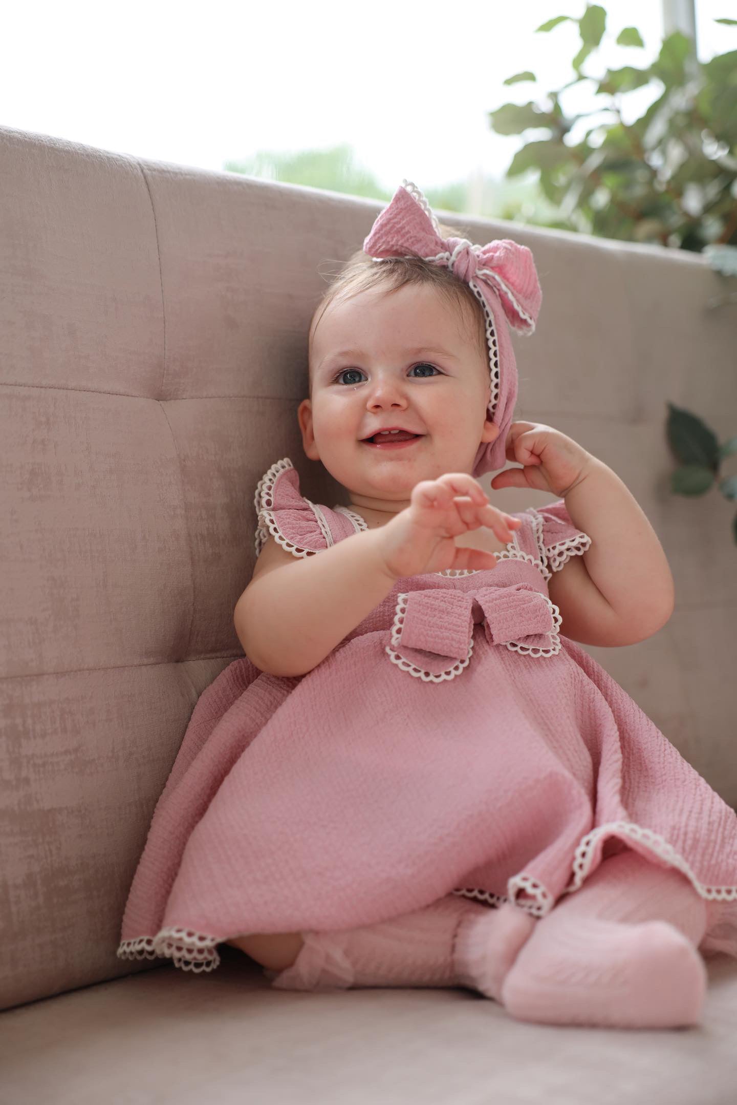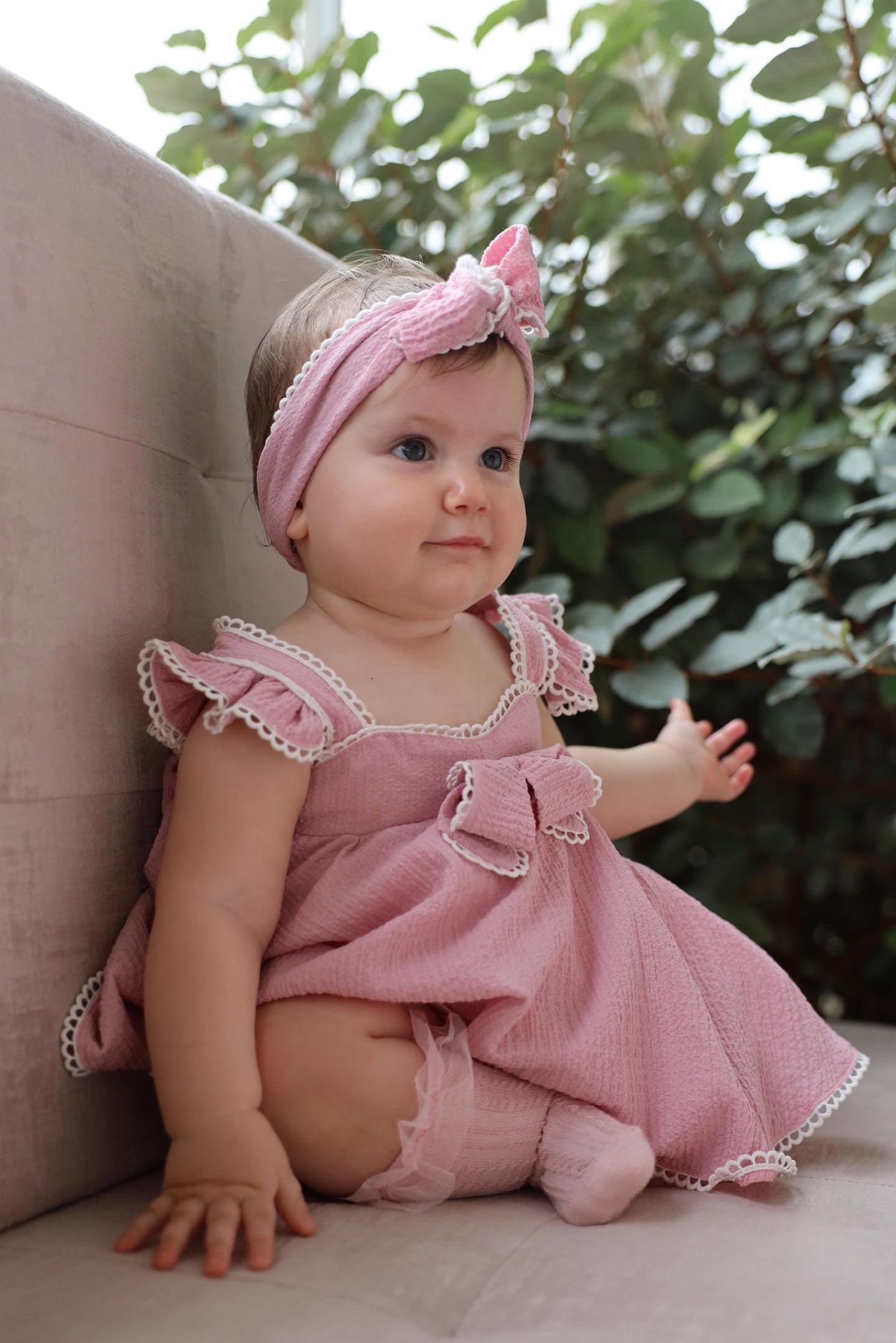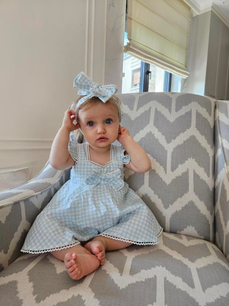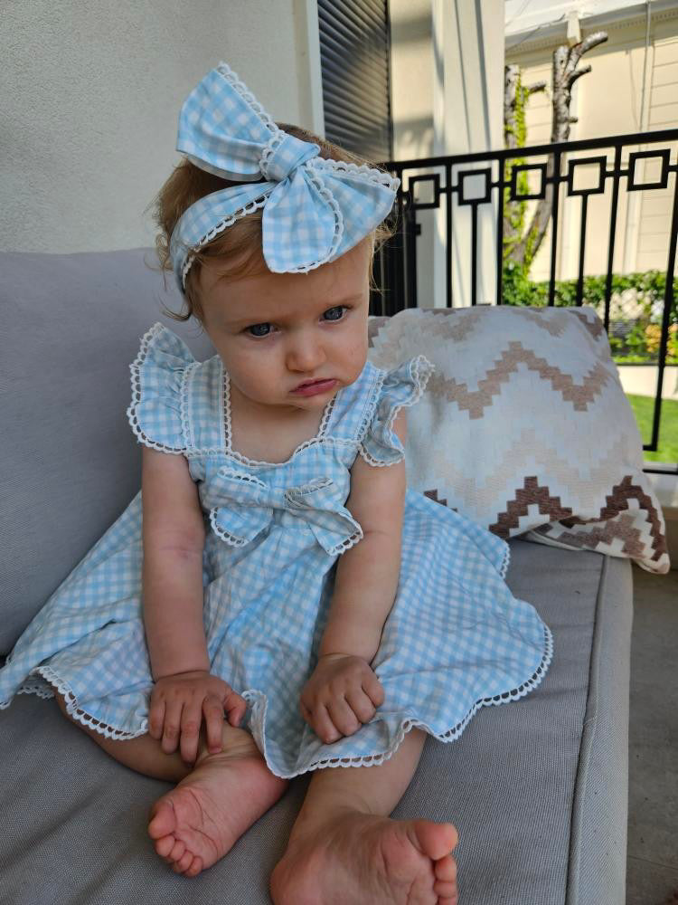 This adorable outfit consists of a lightweight dress with adjustable straps and matching bloomers , perfect for toddlers. The light blue or floral checkered fabric is enhanced with delicate lace and a pretty bow on the front. Easy to put on, comfortable and elegant , it's an ideal choice for sunny days or a special occasion.
